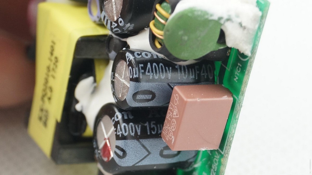 The power supply uses three main capacitors with a withstand voltage of 400V, two volumes of 15 microfarads and one for 10 microfarads.
